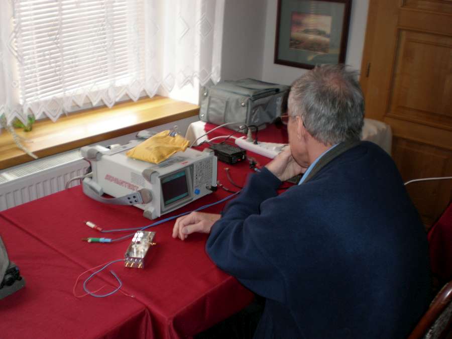 Kolem hotelu zbytky sněhu. Pátek byl ve znamení přátelských setkání,malého bazaru a praktického sledování záznamů pořízených Zdenkěm OK1DFC v digi formě spojení EME na 432 MHz s KP4AO.Tak jsem si to také zkusil,bylo to velmi zajímavé a podnětné pro mou další radioamatérskou práci.V sobotu bylo plno přednášek a měření donesených zařízení a pomůcek.Člověk nestíhal být na všech místech , které ho zajímala.Zajímavá přednáška byla od DL2AM o jeho konstrukci pro 76 GHz se zesilovačem 60 mW, jeho konstrukci a problémech.Dále se zmínil o svém rekordním evropském spojení na 76 GHz a jak to probíhalo.